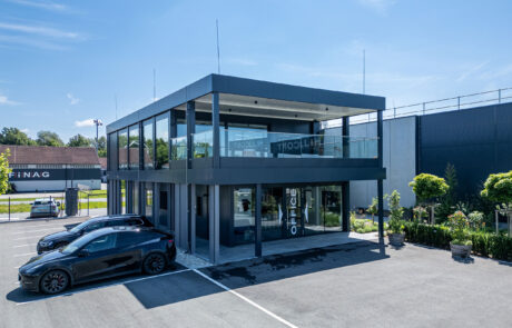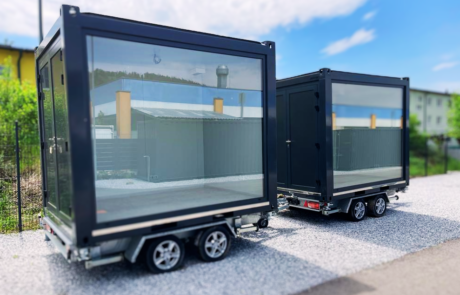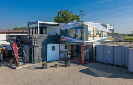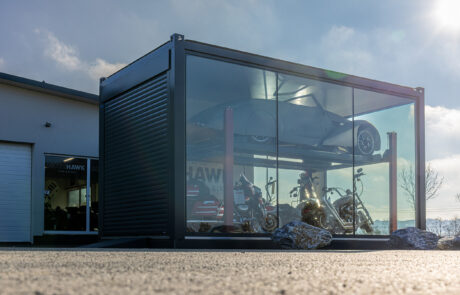 - Container für Roadshows und Messeeinsätze mit Designelementen wie Glas und Fassaden